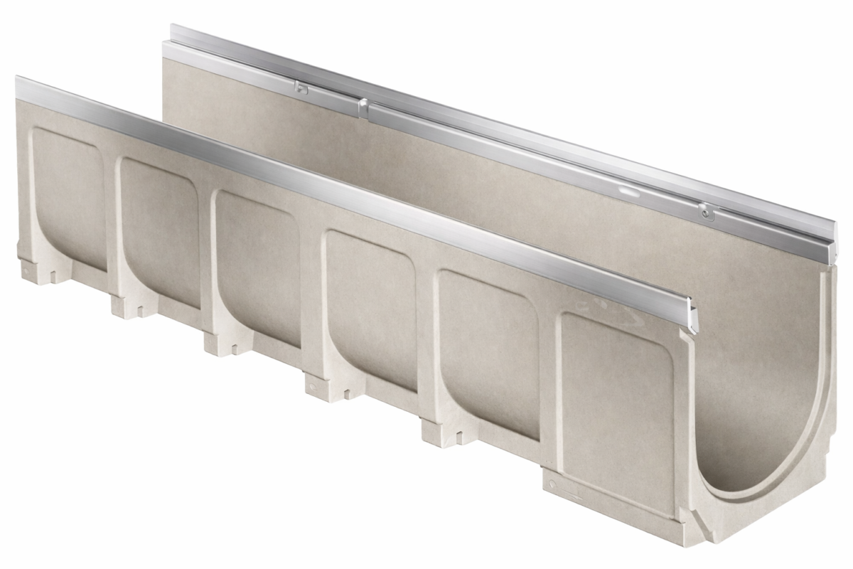 Le béton s’impose depuis de très nombreuses années dans le domaine du drainage de surface grâce à sa stabilité et à sa longévité. Polyvalent, il est mis en œuvre pour des classes de charge B 125 à F 900 en raison de sa résistance exceptionnelle aux chocs, à l’usure et aux températures extrêmes (jusqu’à 250°C).